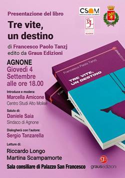 Ad Agnone, giovedì 4 settembre, nella sala consiliare di Palazzo San Francesco, è stato presentato ancora una volta il romanzo Tre vite, un destino. Dopo l’introduzione di Marcella Amicone del Centro Studi Alto Molise “Luigi Gamberale”, che ha moderato l’incontro, e il saluto del Sindaco Daniele Saia, c’è stata la relazione di Sergio Tanzarella che ha sapientemente affrontato le diverse tematiche presenti nel libro, soprattutto per quel che riguarda il mondo della scuola. Le letture sono state effettuate da Riccardo Longo e da Martina Scampamorte. Molti gli interventi del pubblico presente.